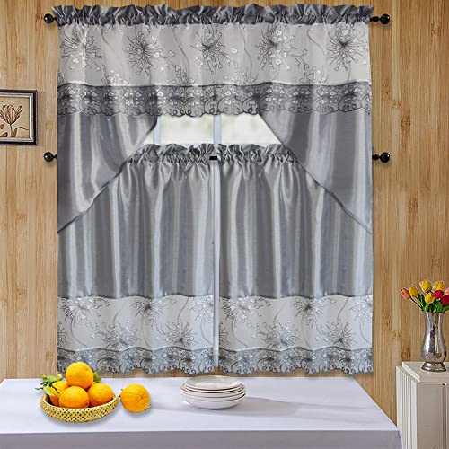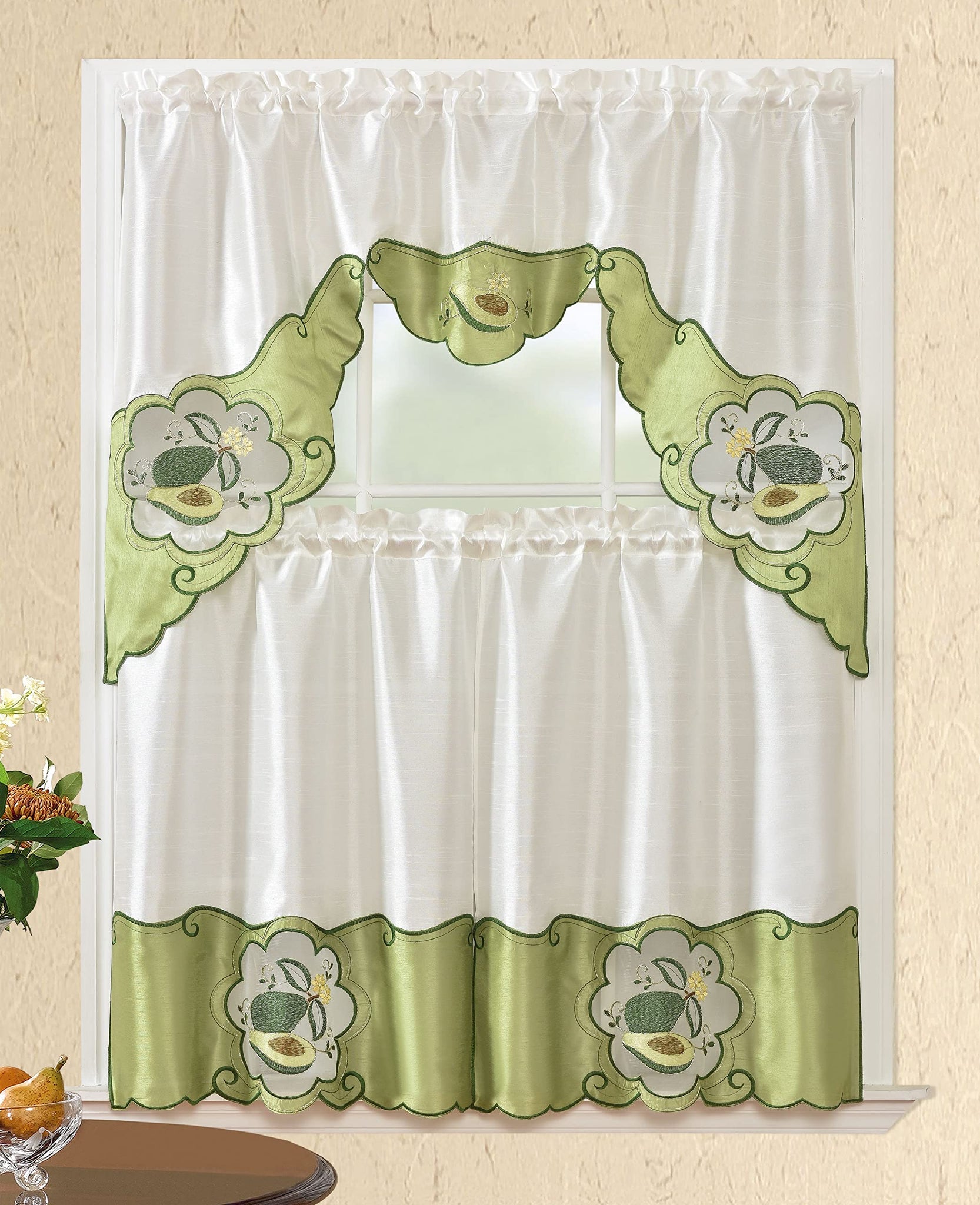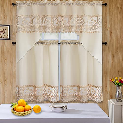 Details: Beautifully designed 3pc Kitchen Curtain Set. Perfect for anyone looking for a curtain that will still bring in light. Perfect for any kitchen. Included in the package is (1) Valance and (2) Tiers.